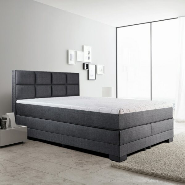 Het is een complete boxspring, voorzien van twee onderboxen voorzien van luxe sierlijst, één groot matras met geïntegreerde topper en een vlak hoofdbord of luxe 8 vlaks hoofdbord. Het hoofdbord is 100 cm hoog en is gelijk aan de breedte van je boxspring. Dit sluit naadloos aan bij de strakke uitstraling van het bed. De lighoogte van je bed is 60 cm en is hiermee een perfecte instap voor de meeste mensen. De onderboxen zijn 28 cm hoog incl sierlijst, met daar bovenop een 25 cm dik matras.